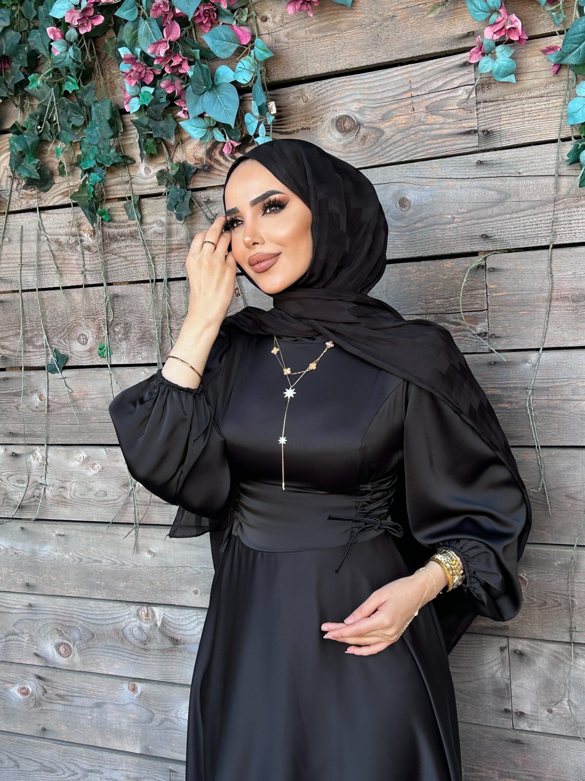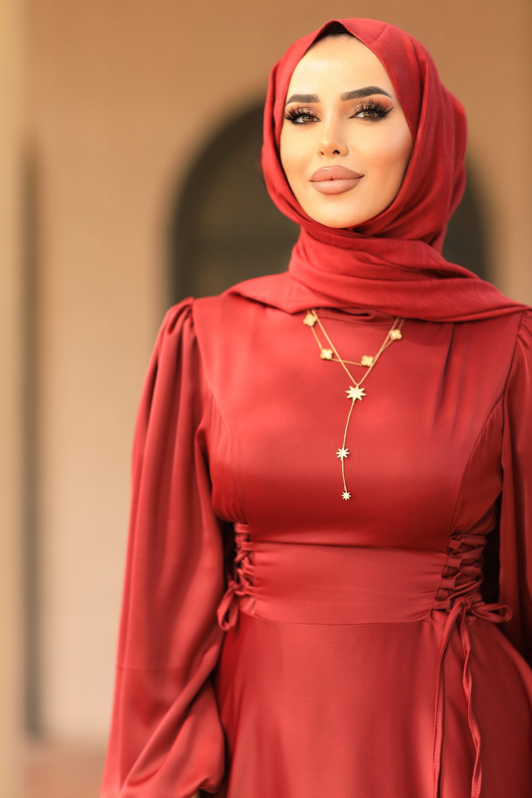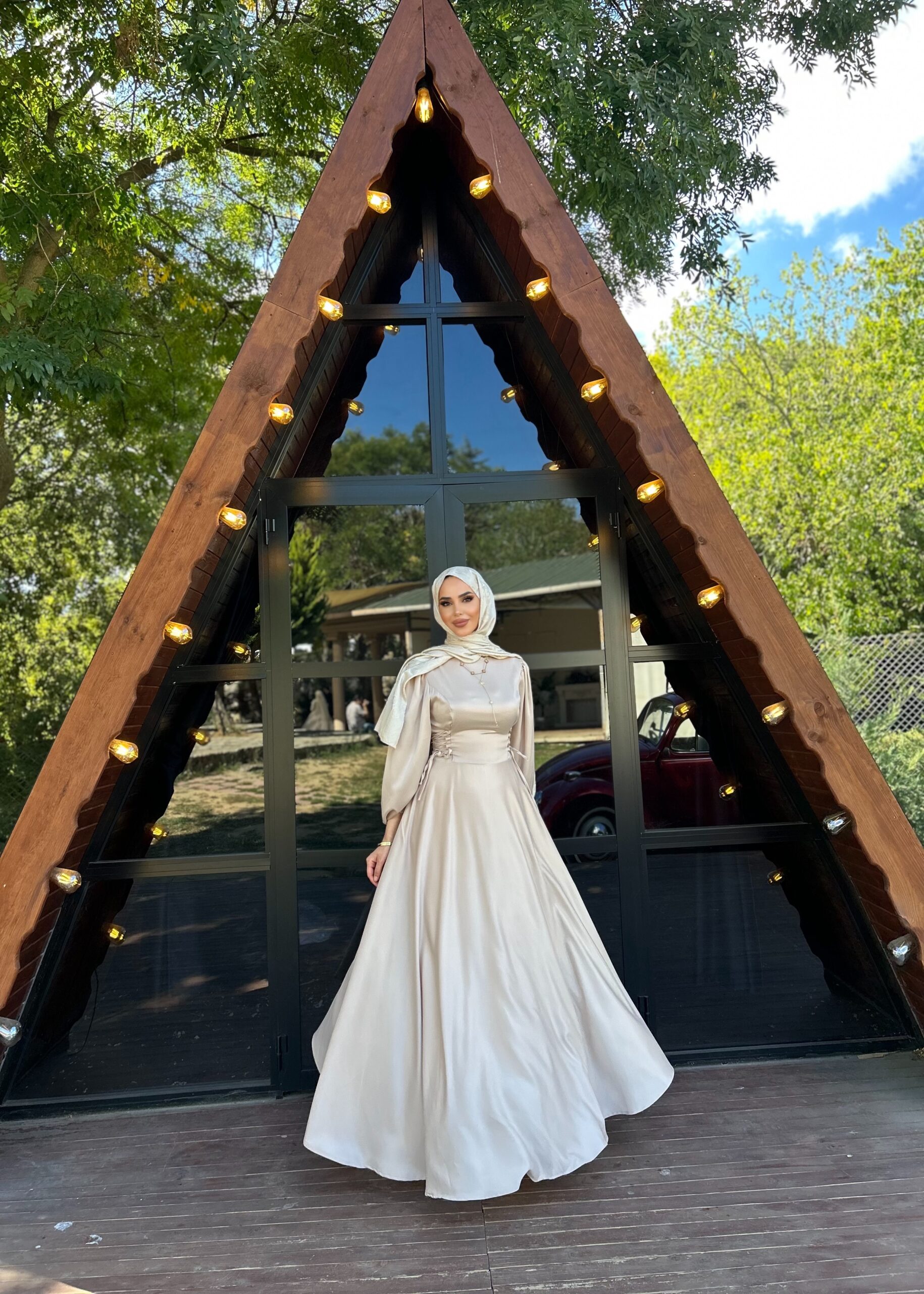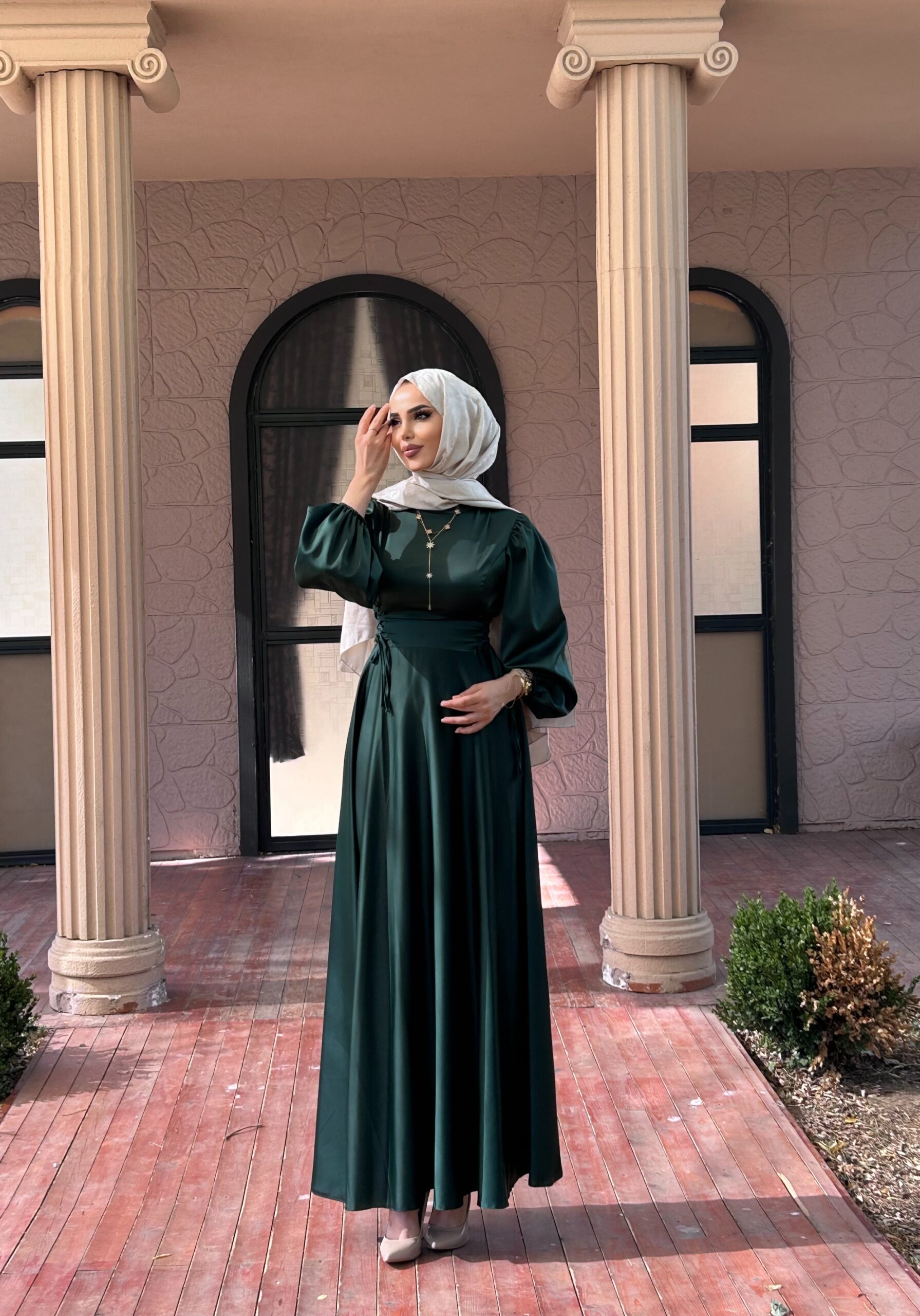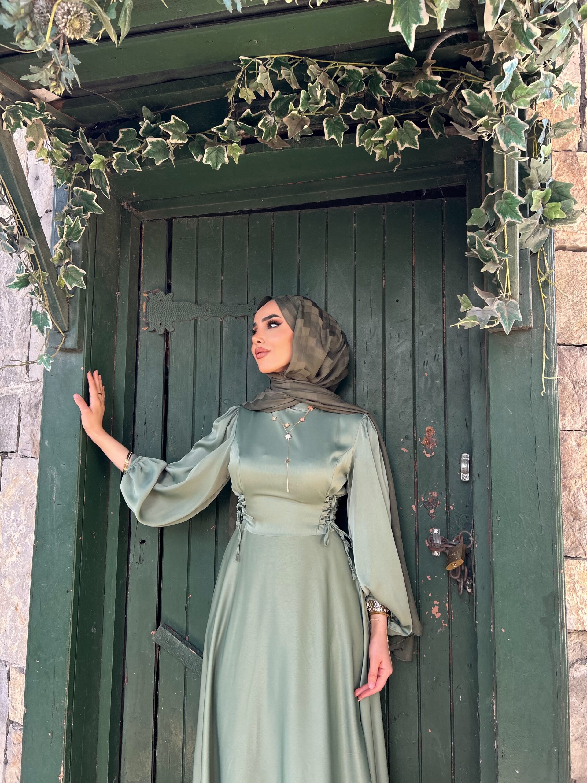 Zarif ve modern çizgileriyle öne çıkan bu saten tesettür elbise, özel günlerinizde şıklığınızı tamamlayacak. Akıcı kumaşı ve ışıltılı dokusuyla hem rahatlığı hem de zarafeti bir arada sunar. Bel kısmındaki bağlama detayı vücut hatlarını zarifçe ortaya çıkarırken, geniş etek kesimi özgürce hareket etmenizi sağlar.